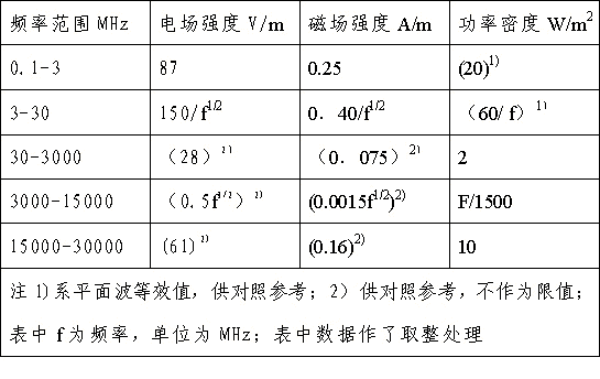 4、对于脉冲电磁波,除满足上述要求外,其瞬时峰值不得超过表中1、2所列限值的1000倍。